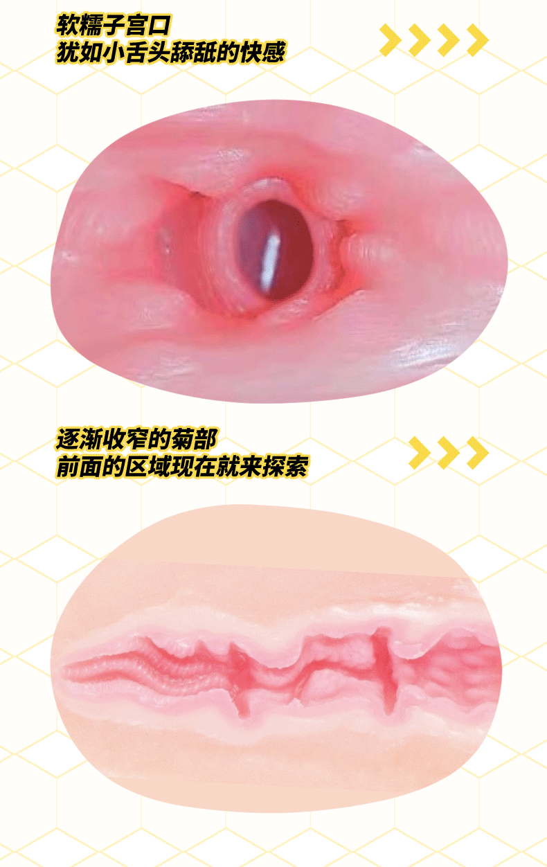 入口处为粉红小馒头,扒开馒头可以看到芥末的入口以及欢乐豆。缓缓探入可以体会到来自芥末肉壁有节奏的按摩,继续深入则会感受到来自芥末水母口犹如小舌头般舔舐般的快感。同样的小菊花也不能放过,我们可以看到菊的肉粒是由大到小,由稀到密的这样一个设计,并且越是深入越能感受到来自两旁肉壁的压迫感。